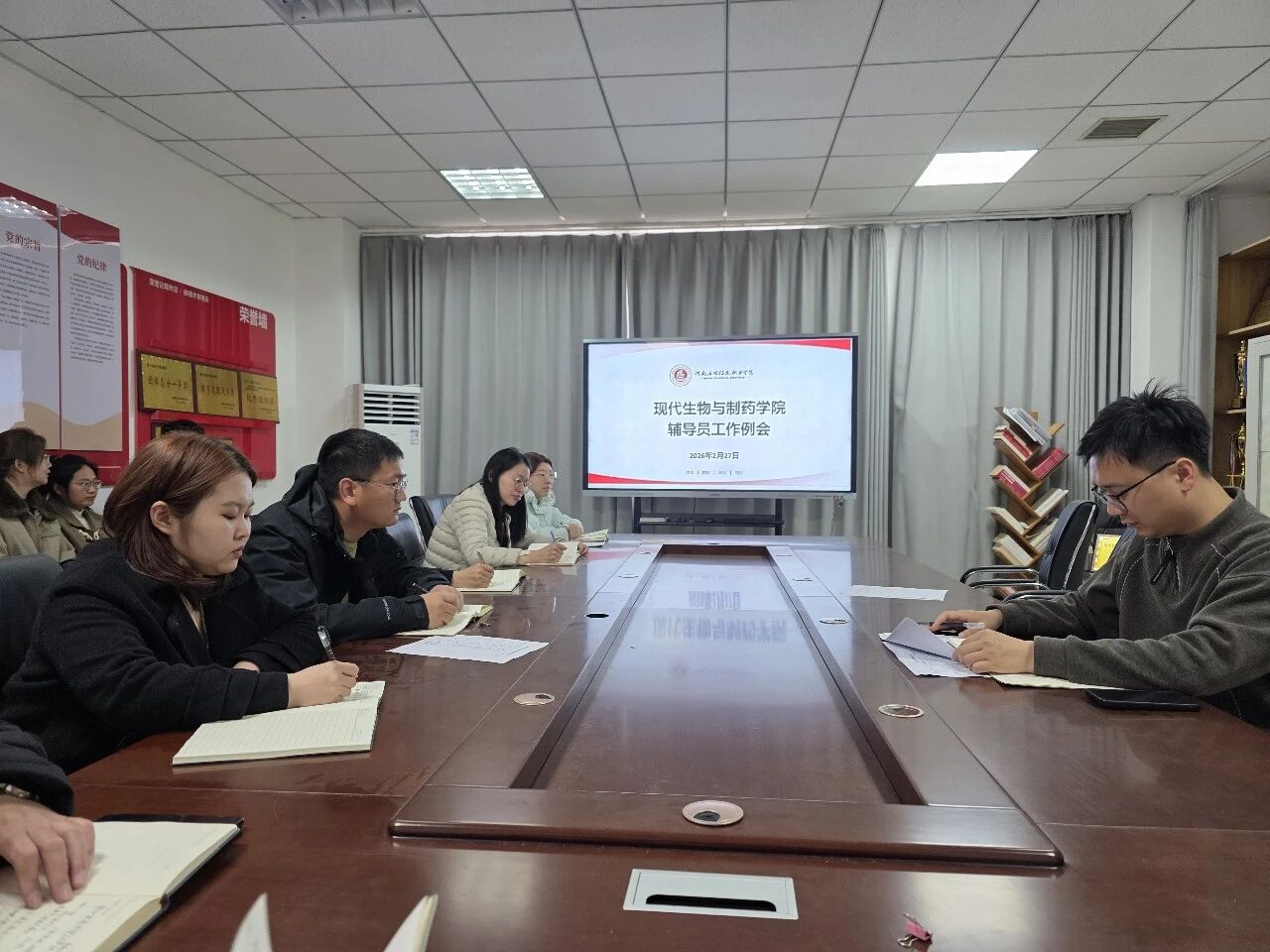 为扎实做好学生管理工作,明确工作方向,压实育人责任,2月27日,现代生物与制药学院在办公楼301活动室召开2026年春季学期第一次辅导员工作例会。党总支副书记王俊永主持会议,全体专兼职辅导员参加。