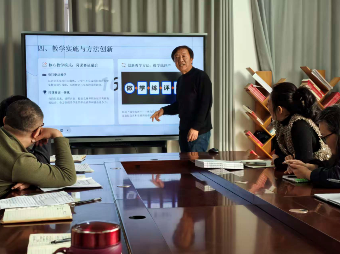 随后,各专业群、专业及课程负责人依次进行模拟汇报,围绕专业集群协同性、岗位适配性、课程能力导向性等维度进行陈述。与会教师结合评审标准,从内容逻辑、数据支撑、表达呈现等方面提出修改建议,现场讨论深入,氛围浓厚,达到了相互启发、共同提升的效果。