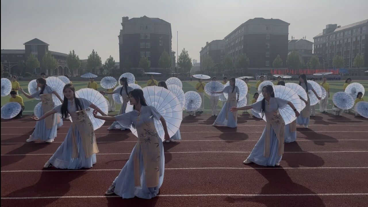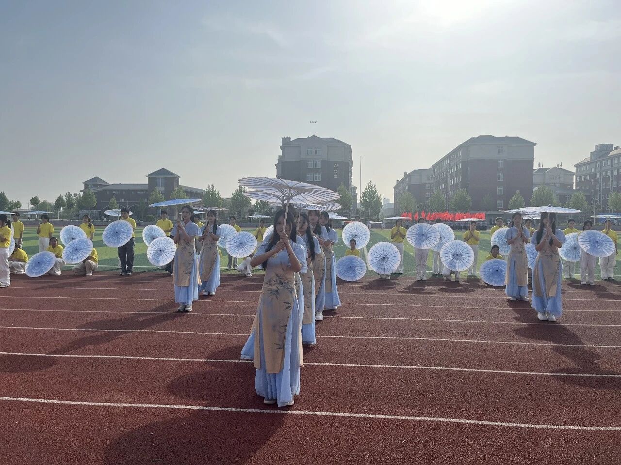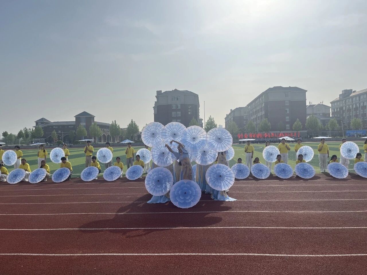 随后,方阵同学带来了具有中国风的《茉莉伞韵》,表演者手持蓝色油纸伞,身姿轻盈,动作舒展流畅、整齐划一,生动展现了新时代青年对文化自信的坚守与传承,赢得了在场师生的热烈掌声。