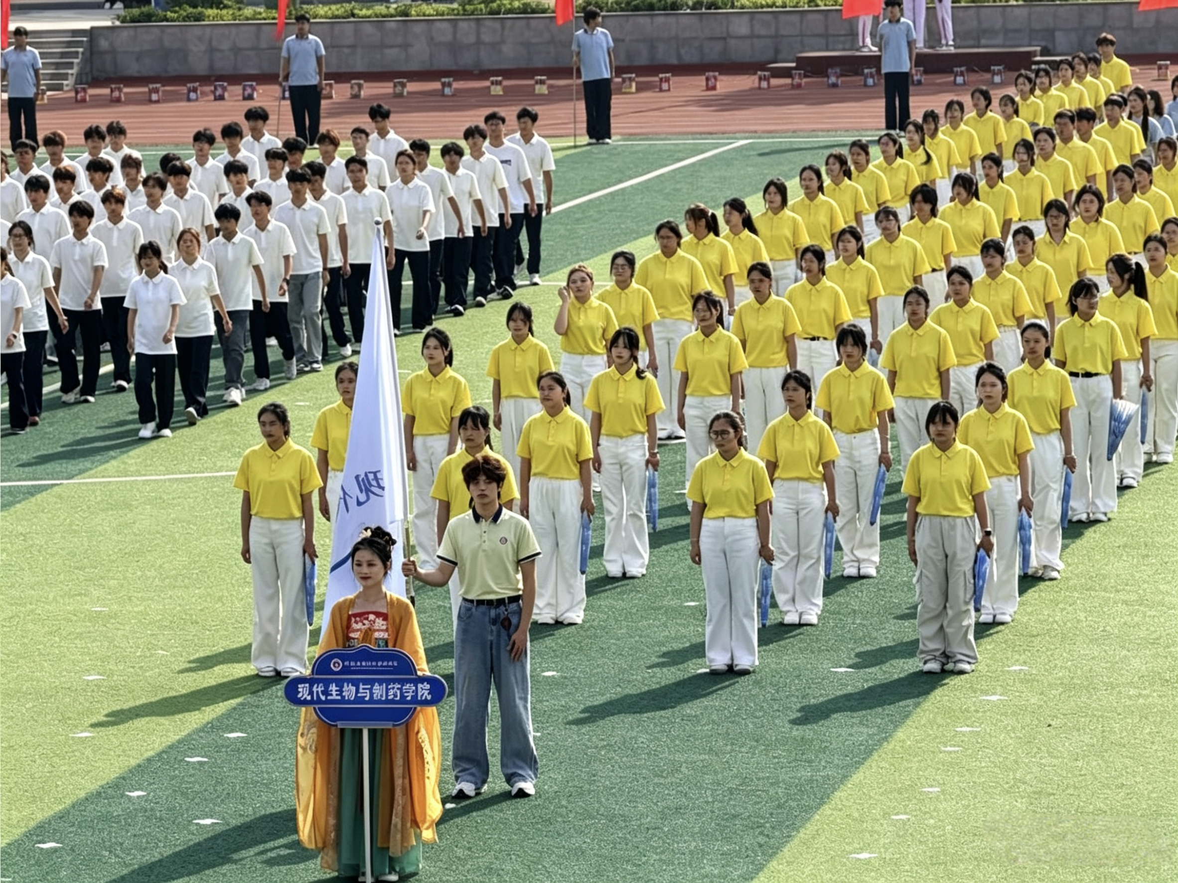 开幕式上,激昂的运动员进行曲响彻全场,现代生物与制药学院方阵迈着坚定的步伐稳步走来。学子们身着整齐服装,身姿挺拔、精神抖擞,彰显了制药学子朝气蓬勃、奋勇拼搏、团结共进的青春模样。