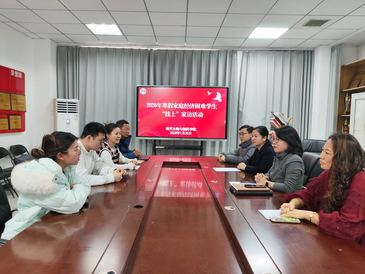 为扎实推进资助育人工作,切实关心家庭经济困难学生寒假生活状况,1月26日,现代生物与制药学院以线上视频连线形式,开展2026年家庭经济困难学生“线上”家访活动。学院党总支书记梁艳、院长王湘妍、党总支副书记王俊永、副院长高莉丽、资助专员焦汉生及辅导员代表参与此次活动,与学生代表进行“零距离”线上交流。